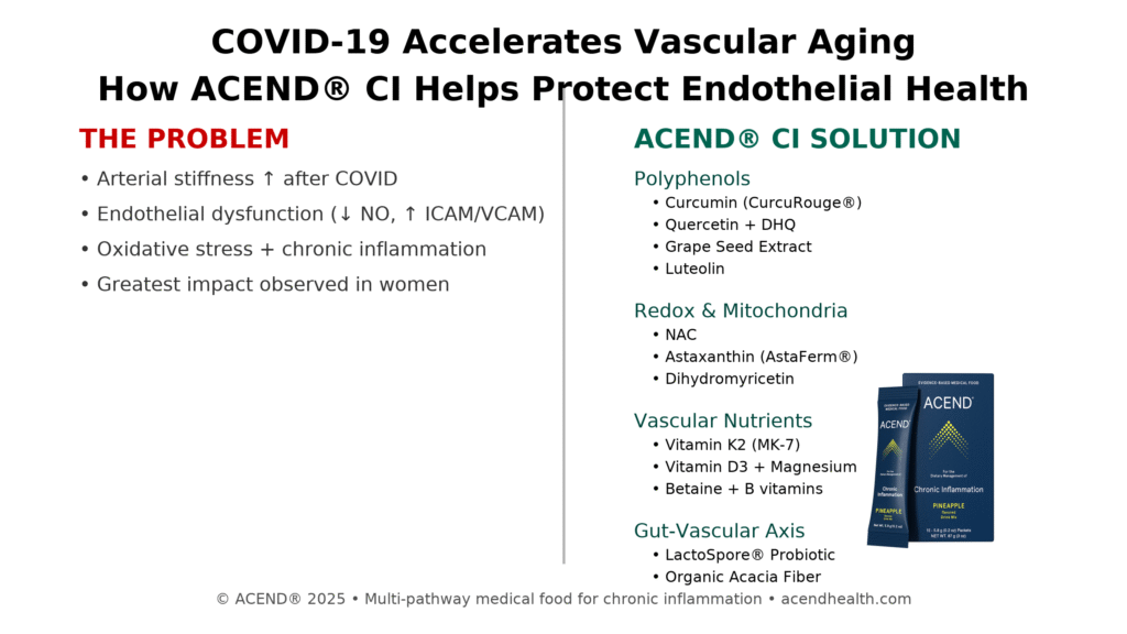 - Women’s health emphasis: Because the strongest arterial-stiffness signals post-COVID have been observed in women—including post-menopause—ACEND-CI’s inclusion of MK-7 (arterial stiffness data in postmenopausal women) and curcumin/GSE (FMD and PWV support) is strategically relevant. (PubMed)